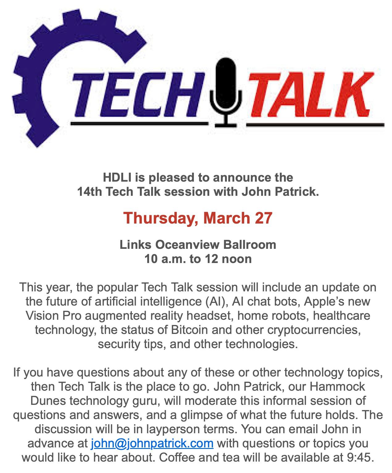 My annual Tech Talk this year (#14) will be at 10am on March 27 in the Oceanview Ballroom at Hammock Dunes Club in Palm Coast. I will be talking about the latest with AI and Bitcoin. If you are in the area but not a member of the Club, let me know and I will be glad to add you to my guest list.