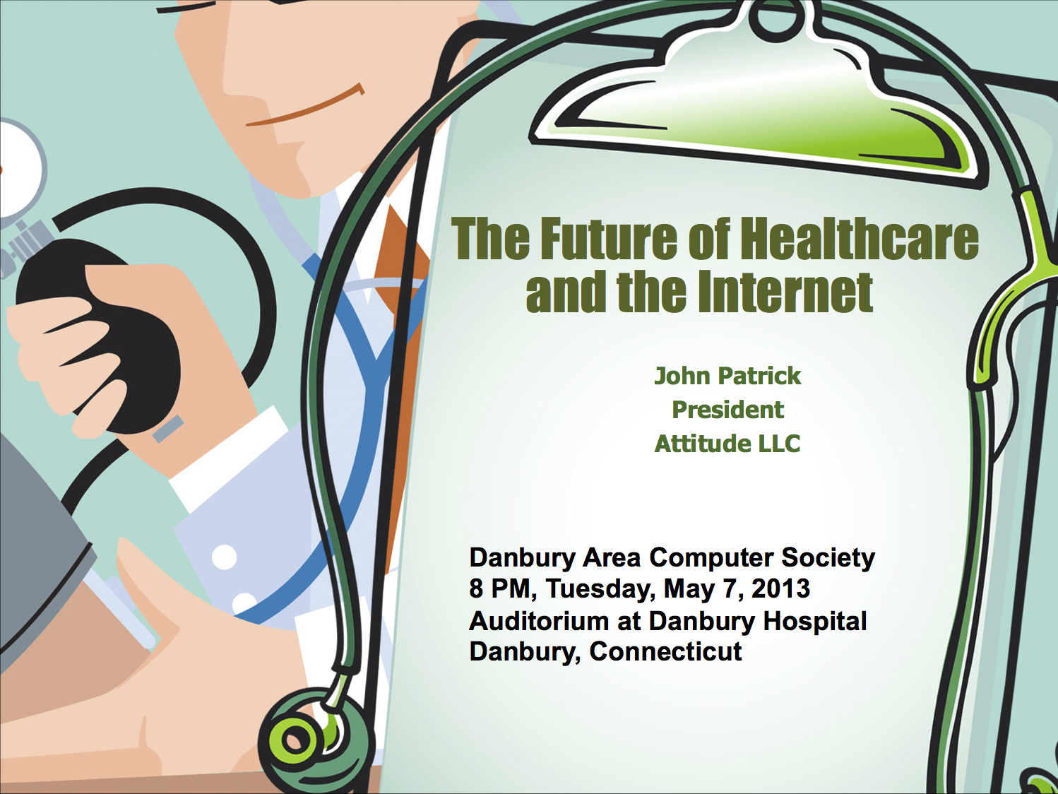 On May 7th, the Danbury Area Computer Society will hold it’s monthly meeting, and it will be my honor to give a talk there about The Future of the Healthcare and the Internet. This will be the twenty-first year in a row that I have shared my thoughts with this fine group. The meeting will be open to the public and will take place in the auditorium at Danbury Hospital at 8PM. Following are some examples of the things I will be talking about on May 7th.