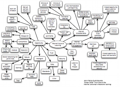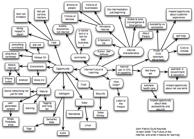 On April 16th, I gave a keynote at the eLearning Guild AG08 Annual Gathering where I talked about the future of the internet and implications for learning. Below is a video clip [6:31] of the address, and a mindmap of the presentation created by Clark Quinn who attended the keynote – click the image to see a larger version.