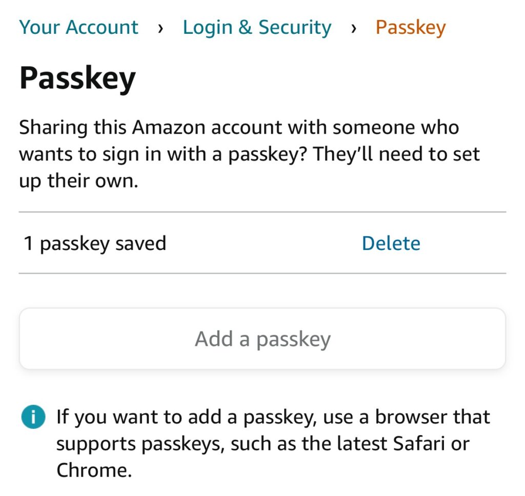 Using your browser on your desktop or laptop, go to Amazon and then Your Account, then Login & Security, and then click Passkey. Once you have authenticated with your fingerprint or faceprint on your phone, Amazon will confirm it has created a passkey and stored it in your browser. To test it, logout of your Amazon account and then start from scratch. Enter your email address in the login field and then click “Sign in with a passkey”. You will automatically be logged in. No password.