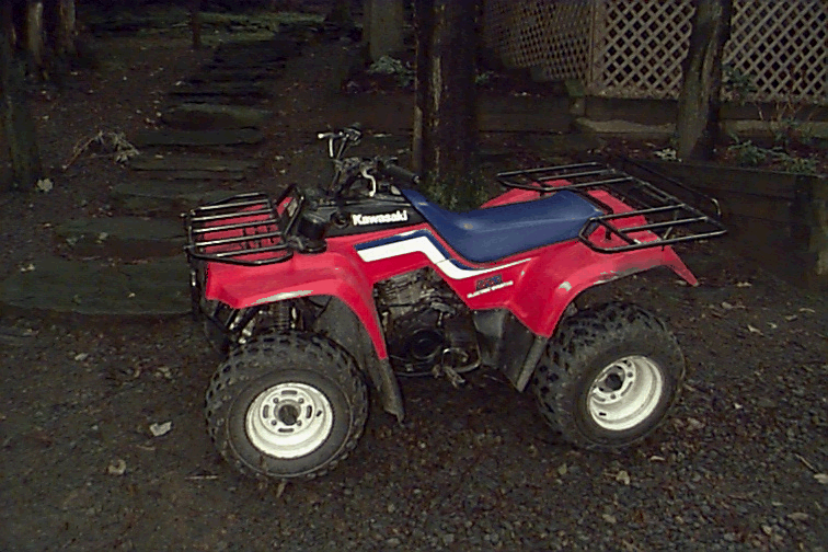 Kawasaki has a lot of interesting things about the Bayou on their Web site. Their Bayou’s look so nice and new. Here is a picture of my dirty ten year old one. It has about 2,400 miles on it as of September 1, 1996. Not much more than the Honda trailbike but in quite a few less years. It provides a lot of utility for moving things around and it also tows the JetSki from the lake.To see a full size picture (50KB), click on the image