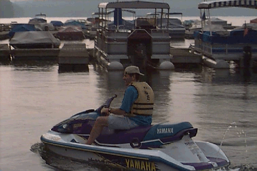 The WaveVenture is the latest addition to the RV collection. Never thought I would want one. In fact some people were quoting me the other day as having suggested they be banned from the lake. Maybe after turning 50 things like this get more interesting! I really enjoy going out on the lake early in the morning or just before dusk when there is very little choppiness in the water. The top speed I have reached is 51 mph. It will do about 40 with two adults and something less with three. As of September 1, it has about 32 hours on it. To see a full size picture (50KB), click on the image.