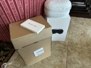 A small box contained the lenses from Zeiss. Apple and Zeiss worked together to design the lenses. They are not needed unless you wear glasses. I selected reading glasses with 1.50 – 1.75 magnification. If you wear prescription glasses, you submit the prescription to Apple and Zeiss makes the corresponding lenses. An alternative is to visit an Apple store with your glasses. They scan your lenses and then get you the corresponding lenses for the Vision Pro. The Zeiss lenses attach to the inside of the headset magnetically. They just pop right in perfectly aligned.