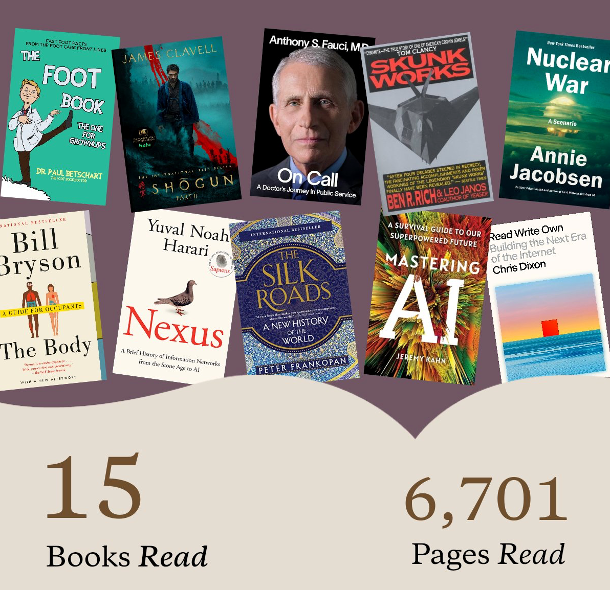 In 2024, it is estimated approximately 500,000 to 1 million books were published through traditional publishing. When including self-published titles, the total number rises significantly, with estimates suggesting close to 4 million new book titles published worldwide this year. The trend is great for readers, not so much for authors. The graphic below shows some of the books I read this year on Kindle. The graphic does not show hardcover books I read.