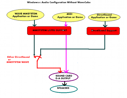 3. WaveCube is capable of mixing MIDI+ WAVE(MMSYSTEM)+ WAVE(DirectSound), all at the same time. When WaveCube is not installed, WAVE-MMSYSTEM and WAVE-DirectSound are mutually exclusive (you can play either one of them, but not both simultaneously). This functionality is enabled in WaveCube since it also performs as a mixer for these 3 independent streams.